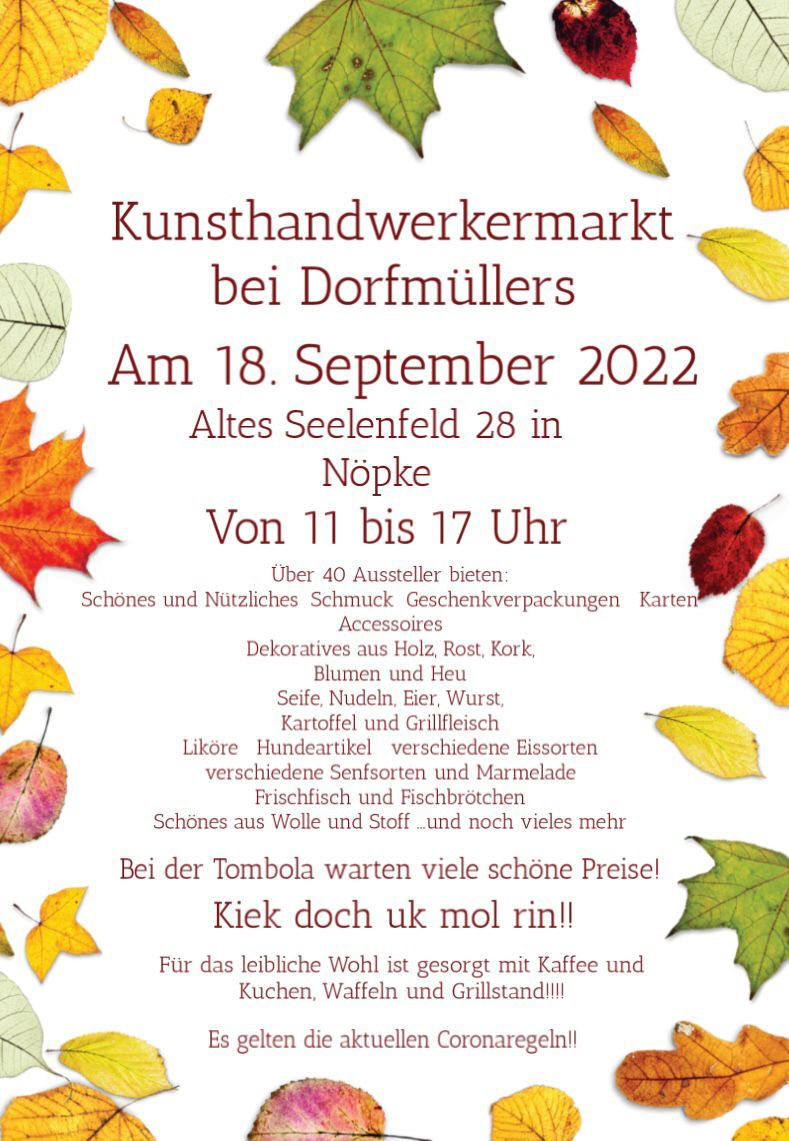 | 18.09.2022 | 11 - 17 Uhr | Sonntag | Nöpke | Dorfmüller | Dorfmüllers Kunsthandwerkermarkt, Altes Seelenfeld 28 - Flyer |